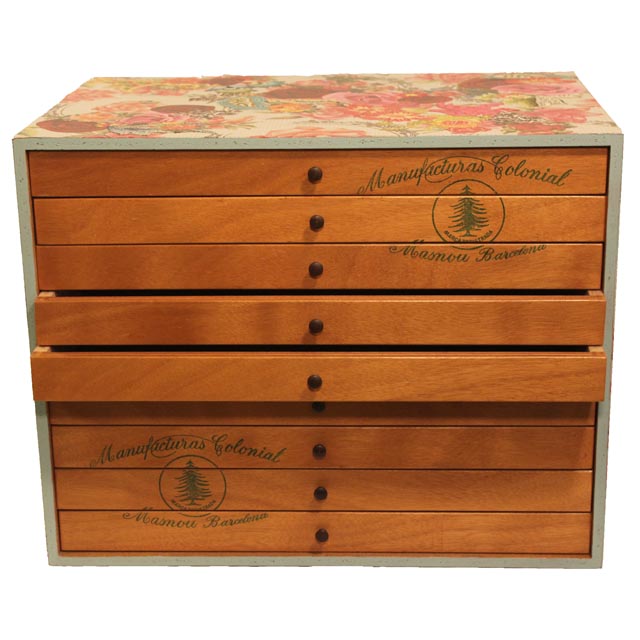 Cajonera originaria de una mercería, que conserva los detalles de la marca. Customizada con un original y divertido découpage realizado a base de diferentes papeles y telas con motivos florales. Ideal para adornar cualquier estancia y para guardar collares, papeles, cintas, botones, etc.